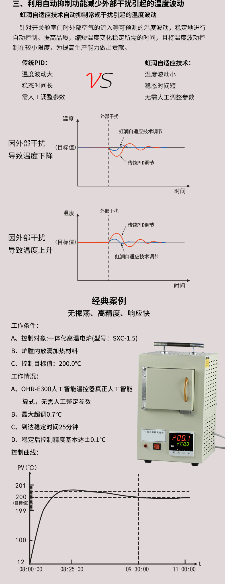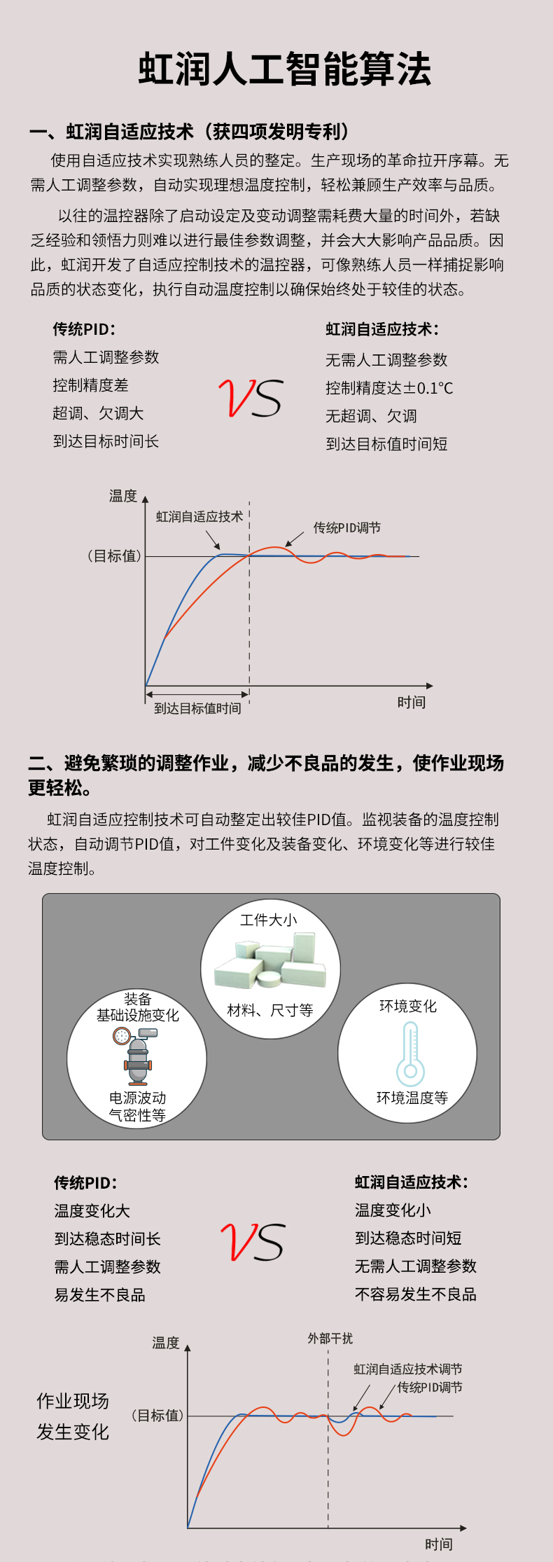 虹潤公司是專業(yè)生產(chǎn)溫控器的國家專精特新“小巨人”企業(yè)。生產(chǎn)的人工智能溫控器,具有真正人工智能算式,無需人工整定參數(shù),控制精度可達±0.1°C,多種輸出類型,高抗干擾等特點。產(chǎn)品獲得模糊PID控制儀及控制方法、人工智能調(diào)節(jié)器、智能化控制器、移相觸發(fā)控制器、閥門自動手動無擾動操作控制方法及裝置等5項國家發(fā)明專利,主持起草工業(yè)過程控制系統(tǒng)用模擬輸入兩位或多位輸出儀表、物聯(lián)網(wǎng)智能溫度儀表通用技術(shù)條件、工業(yè)過程測量和控制系統(tǒng)用智能調(diào)節(jié)器等3項國家標準,以及通信系統(tǒng)多通道數(shù)據(jù)采集控制終端規(guī)范軍用標準,參與國際5G標準制定,取得模糊PID溫控儀等3項相關軟件著作權(quán)。產(chǎn)品廣泛應用于電力、石化,冶金、制藥、食品等幾乎所有工業(yè)現(xiàn)場,實現(xiàn)精準控溫,保障生產(chǎn)安全與質(zhì)量。