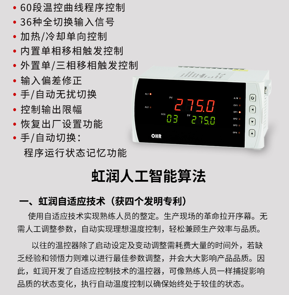 虹潤公司是專業(yè)生產溫控器的國家專精特新“小巨人”企業(yè)。生產的程序段智能溫控器,具有真正人工智能算式,無需人工整定參數(shù),控制精度可達±0.1°C,60段溫控曲線程序,無超調、欠調等特點。產品獲得模糊PID控制儀及控制方法、人工智能調節(jié)器、智能化控制器、移相觸發(fā)控制器、閥門自動手動無擾動操作控制方法及裝置等5項國家發(fā)明專利,主持起草智能溫度儀表通用技術條件、工業(yè)過程控制系統(tǒng)用模擬輸入兩位或多位輸出儀表、工業(yè)過程測量和控制系統(tǒng)用智能調節(jié)器等3項國家標準,,以及通信系統(tǒng)多通道數(shù)據(jù)采集控制終端規(guī)范軍用標準,參與國際5G標準制定,取得60段PID自整定調節(jié)器等3項相關軟件著作權。產品廣泛應用于電力、石化,冶金、制藥、食品等幾乎所有工業(yè)現(xiàn)場,實現(xiàn)精準控溫,保障生產安全與質量。