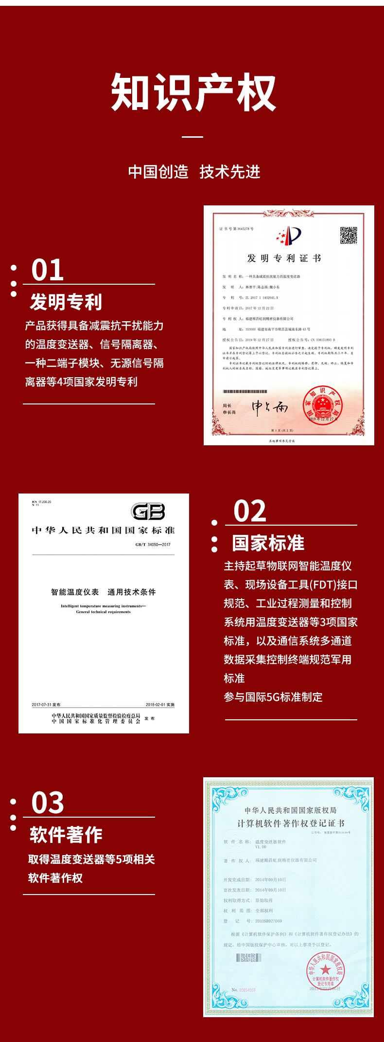 虹潤公司是專業(yè)生產(chǎn)溫度變送器的國家專精特新“小巨人”企業(yè)。生產(chǎn)的溫度變送器,具有采用磁隔離技術(shù),配套編程器可修改參數(shù),抗干擾能力強(qiáng),穩(wěn)定性好,帶RS485或HART通訊等特點(diǎn)。該產(chǎn)品不僅通過HART基金會認(rèn)證、德國萊茵 CE 認(rèn)證與 SIL 功能安全認(rèn)證,還獲得具備減震抗干擾能力的溫度變送器、信號隔離器、一種二端子模塊、無源信號隔離器等4項(xiàng)國家發(fā)明專利,主持起草物聯(lián)網(wǎng)智能溫度儀表、現(xiàn)場設(shè)備工具(FDT)接口規(guī)范、工業(yè)過程測量和控制系統(tǒng)用溫度變送器等3項(xiàng)國家標(biāo)準(zhǔn),以及通信系統(tǒng)多通道數(shù)據(jù)采集控制終端規(guī)范軍用標(biāo)準(zhǔn),參與國際5G標(biāo)準(zhǔn)制定,取得溫度變送器等5項(xiàng)相關(guān)軟件著作權(quán)。產(chǎn)品廣泛應(yīng)用于石油、電力、化工,冶金、制藥、紡織、橡膠制造等工業(yè)領(lǐng)域現(xiàn)場自動(dòng)化測溫過程。