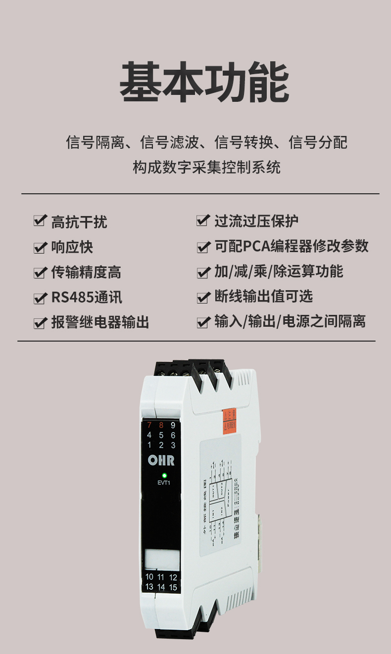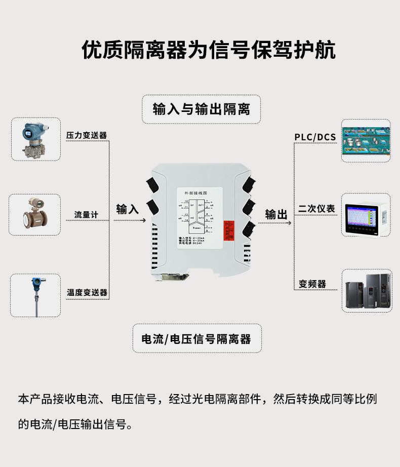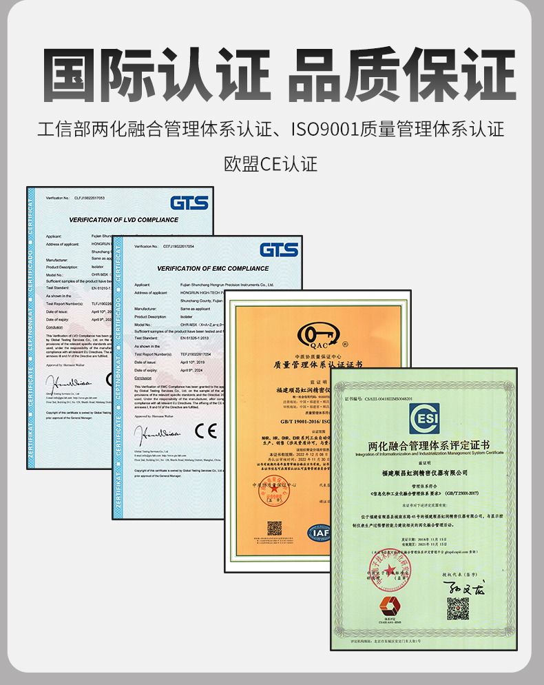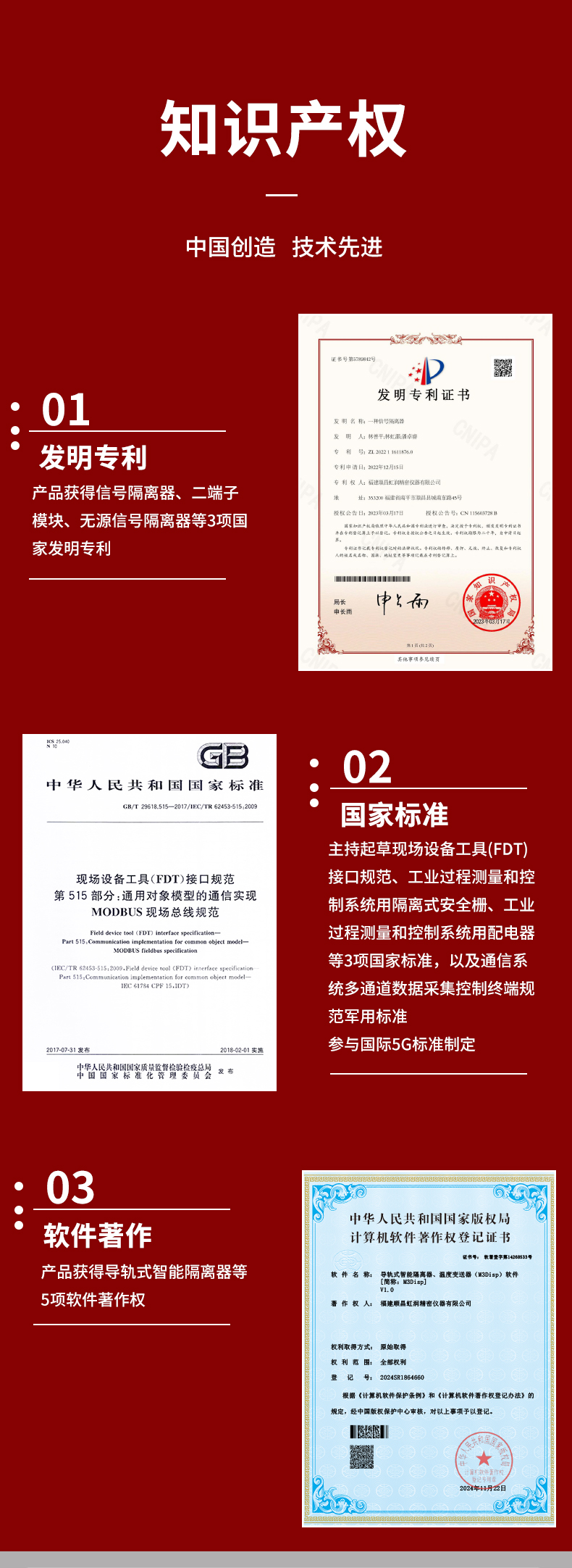 虹潤(rùn)公司是專業(yè)生產(chǎn)隔離器的國(guó)家專精特新“小巨人”企業(yè)。生產(chǎn)的智能信號(hào)隔離器涵蓋電流電壓變送器、溫度變送器、配電器、頻率轉(zhuǎn)換器、開(kāi)關(guān)量轉(zhuǎn)換器及通訊轉(zhuǎn)換器等多種產(chǎn)品類型。產(chǎn)品獲得信號(hào)隔離器、一種二端子模塊、無(wú)源信號(hào)隔離器等3項(xiàng)國(guó)家發(fā)明專利,主持起草現(xiàn)場(chǎng)設(shè)備工具(FDT)接口規(guī)范、工業(yè)過(guò)程測(cè)量和控制系統(tǒng)用隔離式安全柵、工業(yè)過(guò)程測(cè)量和控制系統(tǒng)用配電器等3項(xiàng)國(guó)家標(biāo)準(zhǔn),以及通信系統(tǒng)多通道數(shù)據(jù)采集控制終端規(guī)范軍用標(biāo)準(zhǔn),參與國(guó)際5G標(biāo)準(zhǔn)制定,取得導(dǎo)軌式智能隔離器、頻率轉(zhuǎn)換器等3項(xiàng)相關(guān)軟件著作權(quán)。產(chǎn)品廣泛電力、冶金、工業(yè)電爐、變電站、高壓電機(jī)房等需要電隔離的工業(yè)自動(dòng)化控制系統(tǒng)。
