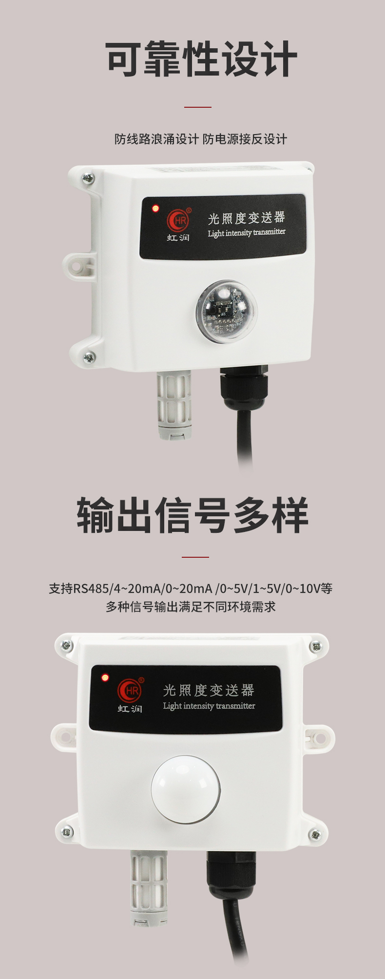 虹潤公司是專業(yè)生產(chǎn)環(huán)境監(jiān)測儀表的國家專精特新“小巨人”企業(yè)。生產(chǎn)的光照度變送器,具有高精度感光傳感器,響應(yīng)靈敏,準(zhǔn)確度高,低功耗,模擬量變送輸出或RS485通訊等特點(diǎn)。產(chǎn)品獲得一種農(nóng)業(yè)監(jiān)控變送器、一種儀表電源等2項(xiàng)實(shí)用新型專利,主持起草現(xiàn)場設(shè)備集成等5項(xiàng)智能制造國家標(biāo)準(zhǔn),以及現(xiàn)場設(shè)備工具(FDT)接口規(guī)范、物聯(lián)網(wǎng)總體技術(shù)智能傳感器特性與分類等2項(xiàng)國家標(biāo)準(zhǔn),參與國際5G標(biāo)準(zhǔn)制定,取得農(nóng)業(yè)監(jiān)測變送器等3項(xiàng)相關(guān)軟件著作權(quán)。產(chǎn)品廣泛應(yīng)用于溫室大棚、花卉養(yǎng)殖、科研實(shí)驗(yàn)、智能樓宇、戶外照明等環(huán)境場合對光照度的檢測。