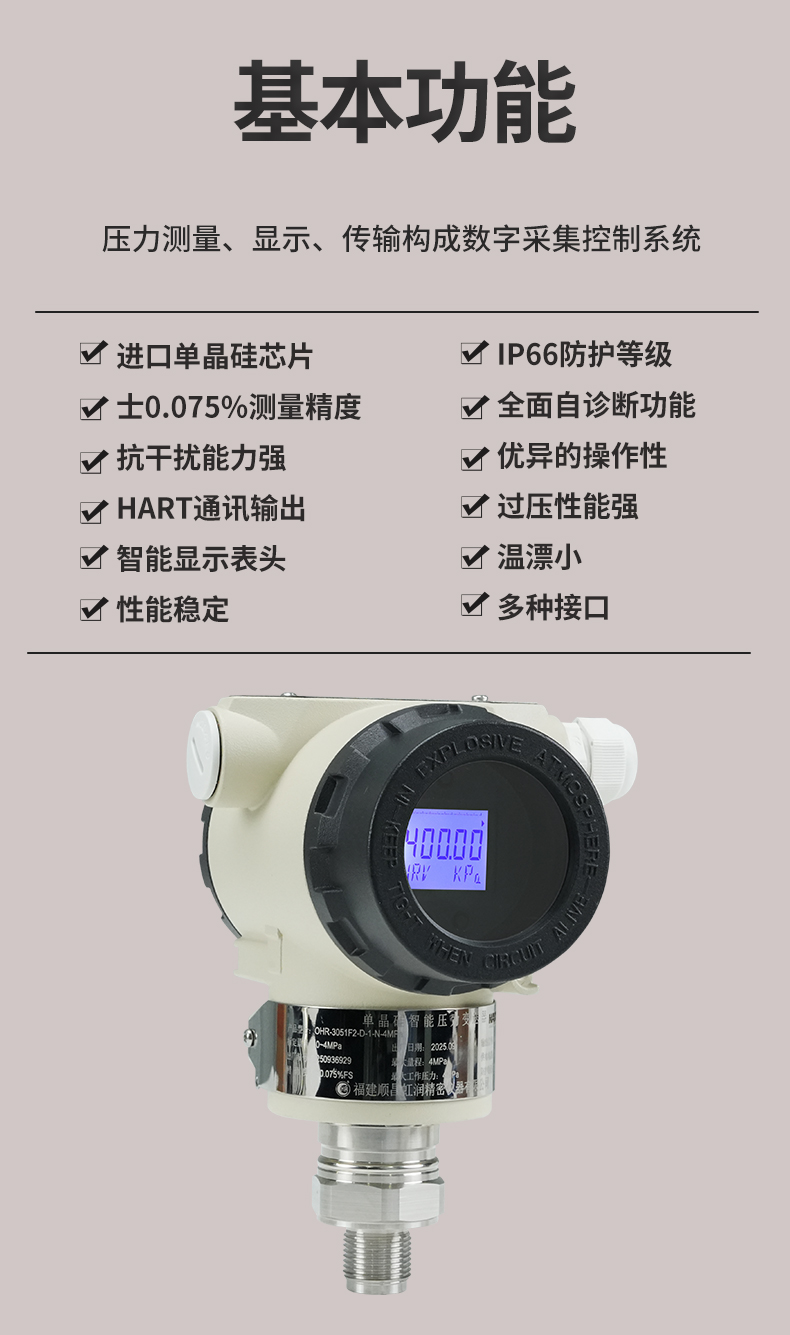 虹潤公司是專業(yè)生產(chǎn)壓力變送器的國家專精特新“小巨人”企業(yè),生產(chǎn)的單晶硅壓力變送器,具有高精度,小溫漂,性能穩(wěn)定,帶HART通訊,抗干擾能力強,自診斷功能等特點。產(chǎn)品獲得一種數(shù)字顯示低功耗壓力表、一種信號發(fā)生器裝置等2項國家發(fā)明專利,主持起草工業(yè)過程控制系統(tǒng)用模擬輸入兩位或多位輸出儀表、工業(yè)過程測量和控制系統(tǒng)用壓力/差壓變送器等2項國家標準,通信系統(tǒng)多通道數(shù)據(jù)采集控制終端規(guī)范軍用標準,以及現(xiàn)場設備集成等5項智能制造國家標準。參與國際5G標準制定,取得數(shù)顯壓力表等2項相關軟件著作權。產(chǎn)品廣泛應用于化工、食品、制藥、電力、設備配套、供暖、水處理、樓宇等行業(yè),需精準測量流體壓力的現(xiàn)場。