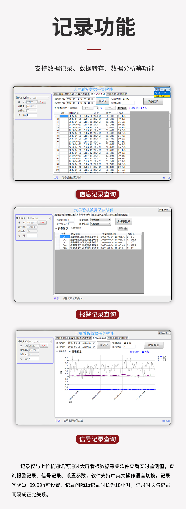 虹潤(rùn)公司是專業(yè)生產(chǎn)環(huán)境監(jiān)測(cè)儀表的國(guó)家專精特新“小巨人”企業(yè)。生產(chǎn)的大屏噪音溫濕度記錄儀,具有高清大屏顯示,數(shù)據(jù)記錄與轉(zhuǎn)存,同步觸發(fā)可靠預(yù)警,RS485或以太網(wǎng)通訊等特點(diǎn)。產(chǎn)品獲得一種手持式低功耗溫濕度檢測(cè)儀、無(wú)紙記錄儀等2項(xiàng)國(guó)家發(fā)明專利,主持起草物聯(lián)網(wǎng)智能溫度儀表通用技術(shù)條件、冷鏈溫度記錄儀等2項(xiàng)國(guó)家標(biāo)準(zhǔn),通信系統(tǒng)多通道數(shù)據(jù)采集控制終端規(guī)范軍用標(biāo)準(zhǔn),以及現(xiàn)場(chǎng)設(shè)備集成等5項(xiàng)智能制造國(guó)家標(biāo)準(zhǔn),參與國(guó)際5G標(biāo)準(zhǔn)制定,取得大屏幕溫濕度數(shù)據(jù)記錄儀等3項(xiàng)相關(guān)軟件著作權(quán)。產(chǎn)品廣泛應(yīng)用于電子制造、醫(yī)療科研、倉(cāng)儲(chǔ)管理、畜牧養(yǎng)殖、建筑工程等諸多領(lǐng)域。